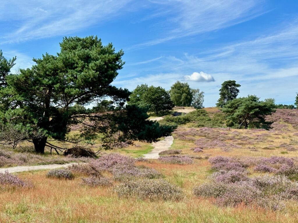 Wir wollten eigentlich schon morgens um 8 Uhr hin, damit das Licht schöner ist und es noch nicht so voll ist. Da es da aber ein dickes Gewitter gab, sind wir erst später um 11 Uhr gefahren. Schön war es trotzdem. Die sandigen Wege, die Wacholderbäume, Heidelbeeren, Birken und natürlich die Heide machen diese Landschaft so besonders.