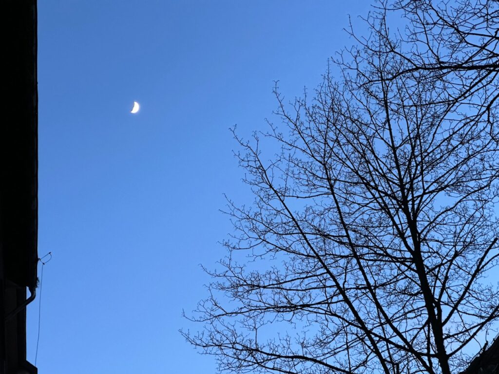 - Am Dienstagmittag ein leckeres und kurzweiliges spätes Mittagessen mit Claudia zu geniessen und auf dem Rückweg den Mond am Himmel zu entdecken.