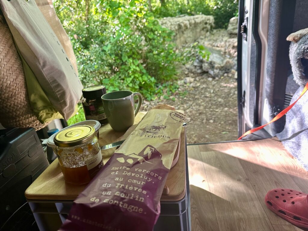 Anschliessend gab es dann erst mal ein gemütliches Frühstück im Auto mit frischem Baguette vom Bäcker, das ich auf dem Weg besorgt hatte.