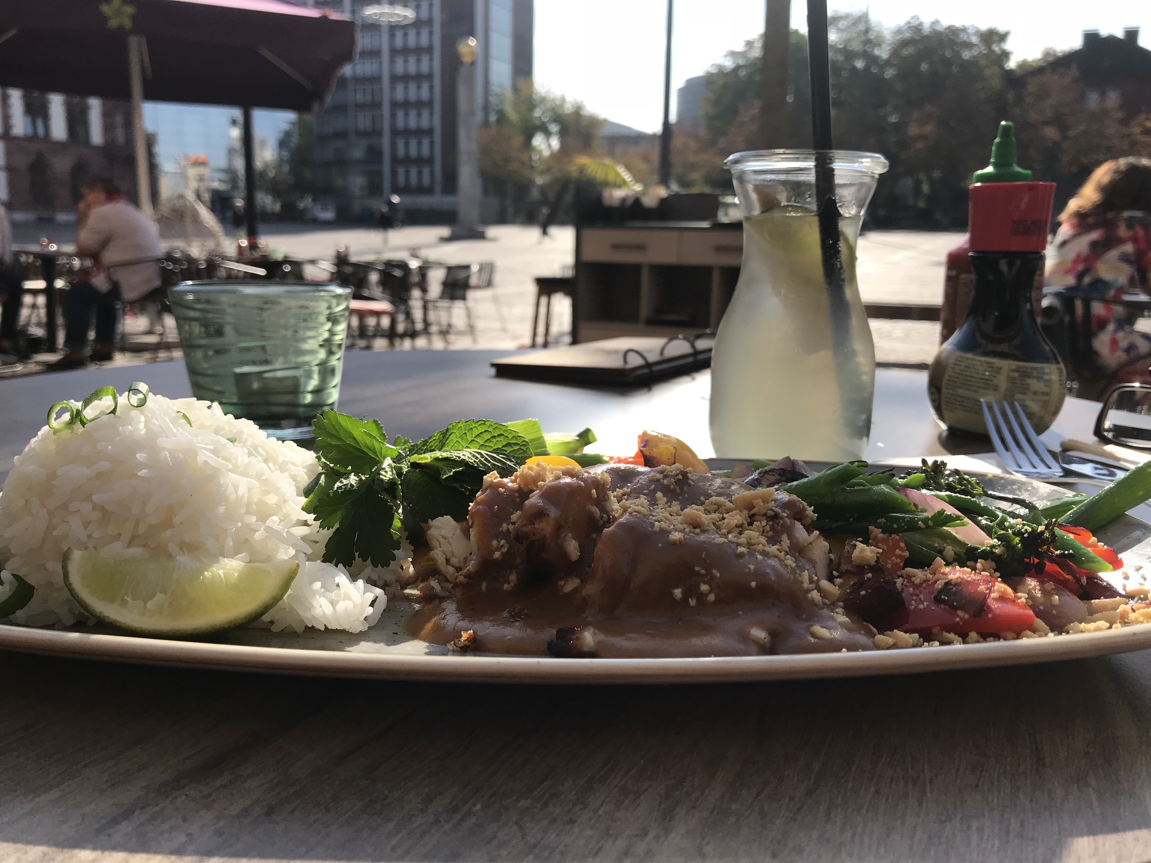Dann hab ich am Mittwoch die Gunst der Stunde genutzt und eine letzte Mittagspause in der Sonne gemacht. Eigentlich wollte ich was besorgen und hatte mich auch mit niemandem verabredet. Aber ich hatte Hunger und fand es albern, am letzten Sommertag des Jahres in den Geschäften rumzulaufen. Also hab ich mich alleine vor das Coa gesetzt und einen leckeren Mittagstisch bestellt. Hach, war das schön! Und die Sonne auf der Haut tat echt noch mal gut.