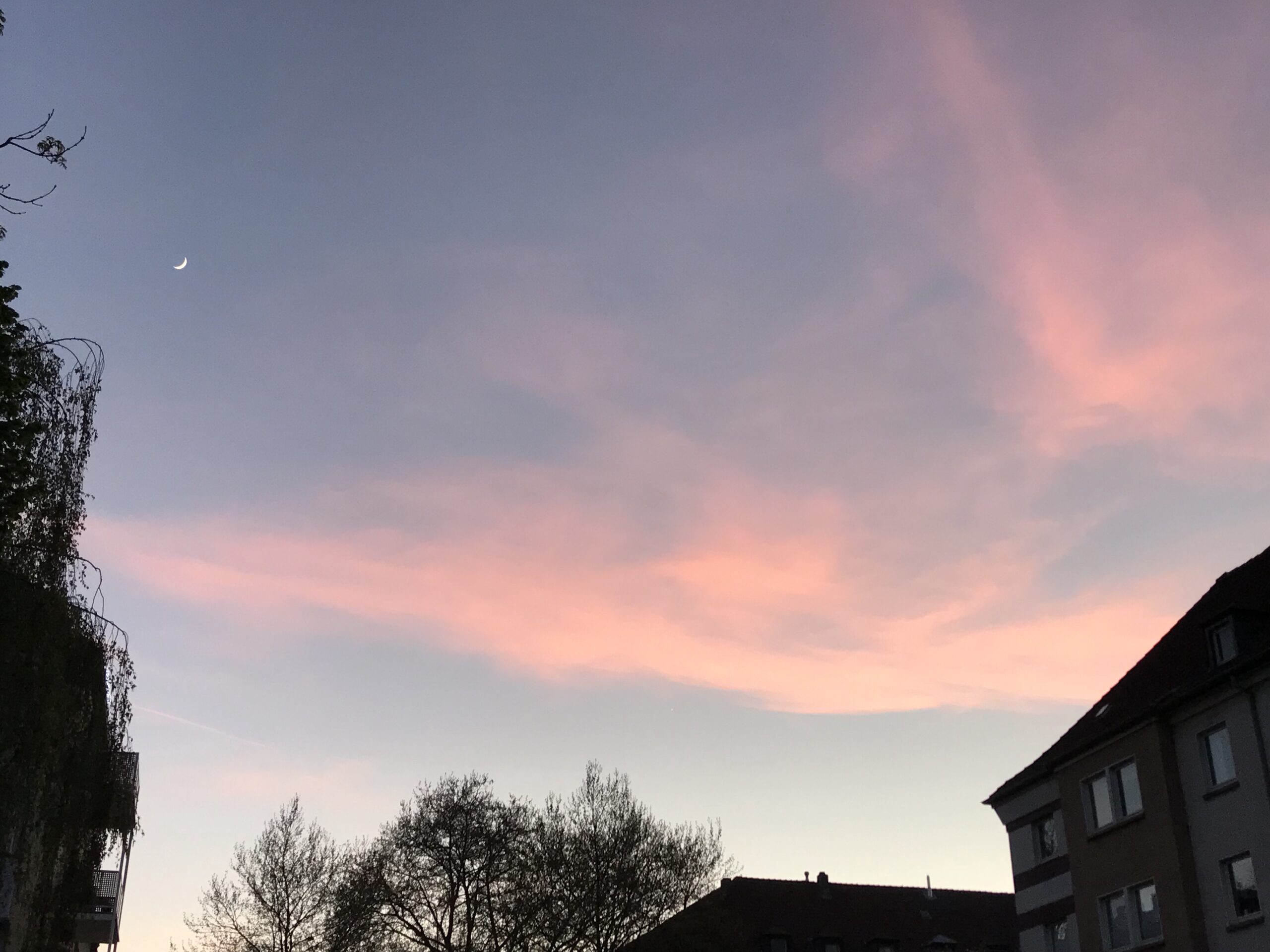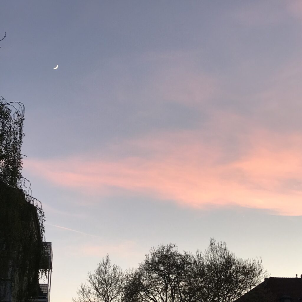 Es dämmert und am Himmel seh ich eine schmale Mondsichel und rosafarbene Schleierwolken.