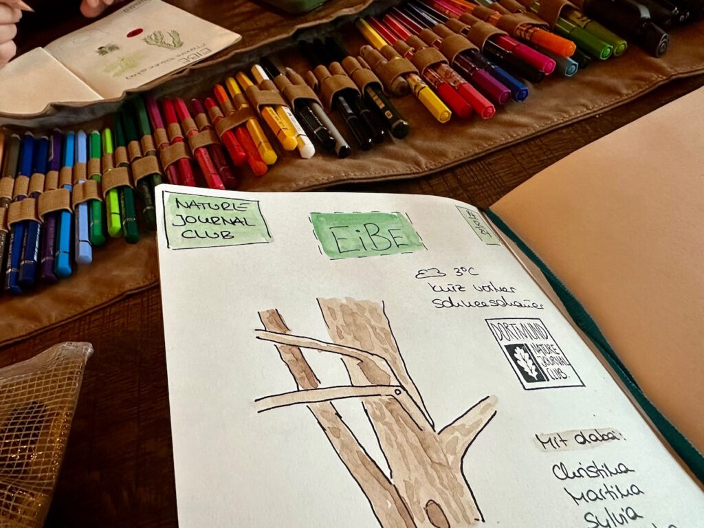 Wir waren jedenfalls acht Personen trotz des ziemlich schmuddeligen Wetters. Erst haben wir eine gute halbe Stunde an den Eiben im Rombergpark verbracht, sie erforscht und uns ausgetauscht und sind dann weiter gegangen ins Purino, einem Italiener um die Ecke. Dort haben wir neben Pasta, Pizzen & Co. unsere Bilder und Gedanken zur Eibe auf Papier gebracht. Das war echt schön und ich bin total happy, dass ich diese Gruppe im Herbst gegründet habe und nun auch hier vor Ort Menschen habe, mit denen ich mein Hobby teilen kann.