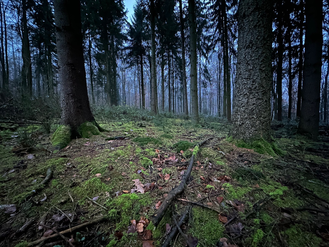 Kurz drauf habe ich mich dann noch in einem Bereich niedergelassen, wo einige Fichten stehen und wo der Boden so gemütlich vermoost ist. Das war ganz zauberhaft, bei diesen besonderen Lichtverhältnissen auf dem Moos zu sitzen und alle Details des Bodens zu betrachten. Du hast das Foto von dort schon als Titelbild gesehen, aber ich stell es hier noch mal ein, weil die Stimmung so toll war.