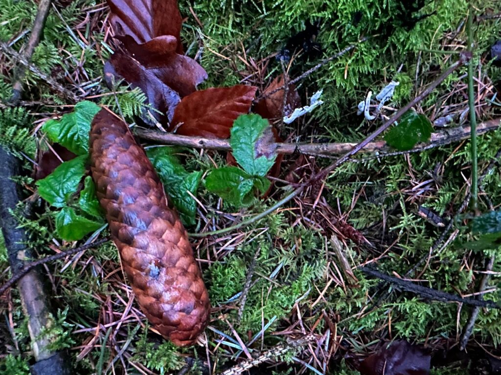 Da verbirgt sich so viel im Moos, was man bewundern kann: Natürlich das gemütliche Moos an sich, Fichtenzapfen und kleine, korallenartige Pilze (oben rechts, die grau-blauen langen Sprossen), Brombeerranken, Buchenblätter und Fichtennadeln. Mich bringen solche kurzen Momente immer total ins Hier & Jetzt.
