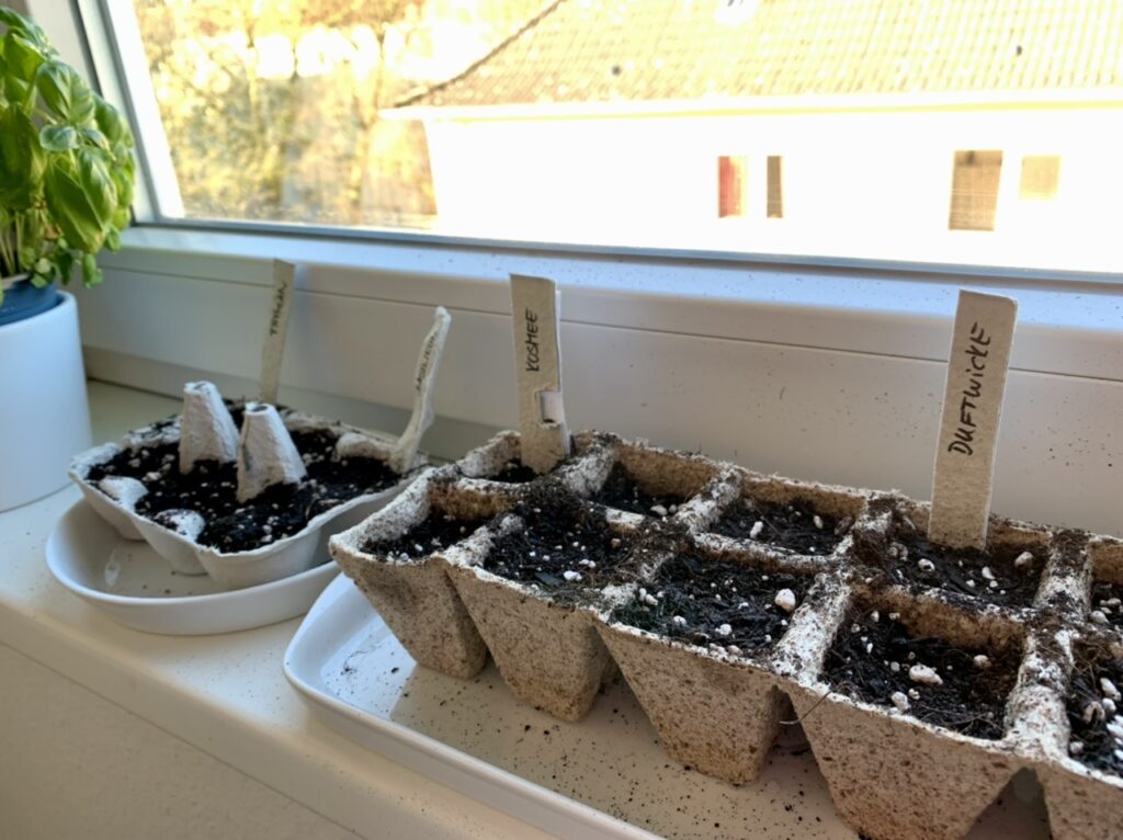 Jetzt stehen die Kartons mit der Erde auf meiner Fensterbank in der Küche und ich hoffe, dass da bald kleine Pflanzen zu entdecken sind. Jeden Morgen sehe ich nach den Töpfchen und fühle mich ein bißchen wie damals als Kind, wenn ich auf`s Christkind gewartet habe. 🙂