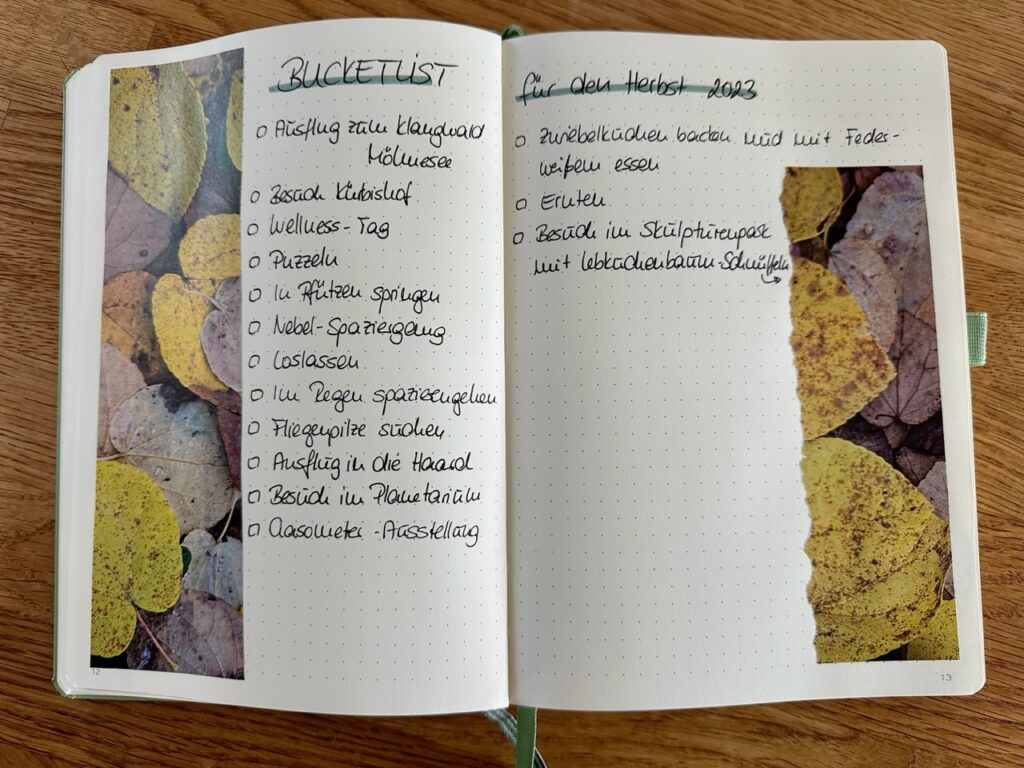 Und da diese Zeit mit dem bunten Laub nur so kurz dauert, ist mir der Herbst besonders kostbar. Und um diese besondere Zeit im Jahr gut auszukosten, habe ich mir vor ein paar Wochen schon eine Bucketlist für den Herbst in meinem Journal angelegt. Mittlerweile habe ich für einige dieser Aktivitäten auch schon Termine im Kalender stehen, so dass die Chance besteht, sie auch wirklich zu erleben.
