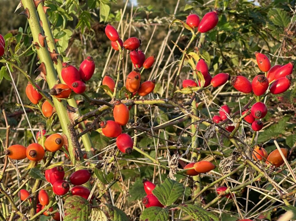 Die knallbunten Hagebutten hatten mich am vorherigen Freitag in der Eifel schon so fasziniert. Wie lustig, dass sie dann am Montag mit der Wildrose mein erstes Studienobjekt bildeten. 🙂