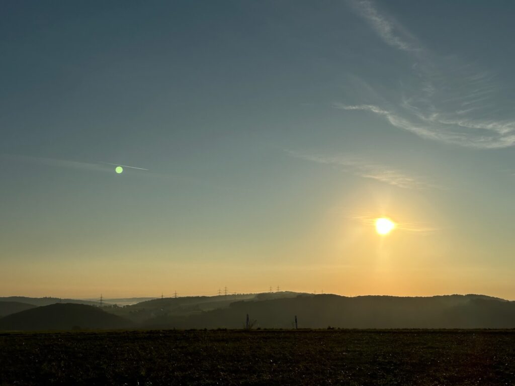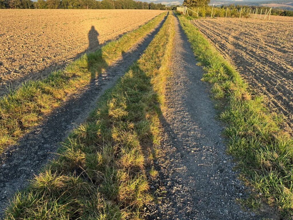 Vor dem Kaffee dreh ich aber mit Lise eine kurze Runde, damit die schon mal zufrieden ist. Dabei konnte ich schöne „Selfies“ machen. Und ich kann sagen: Die Morgensonne macht schön schlank. 😉