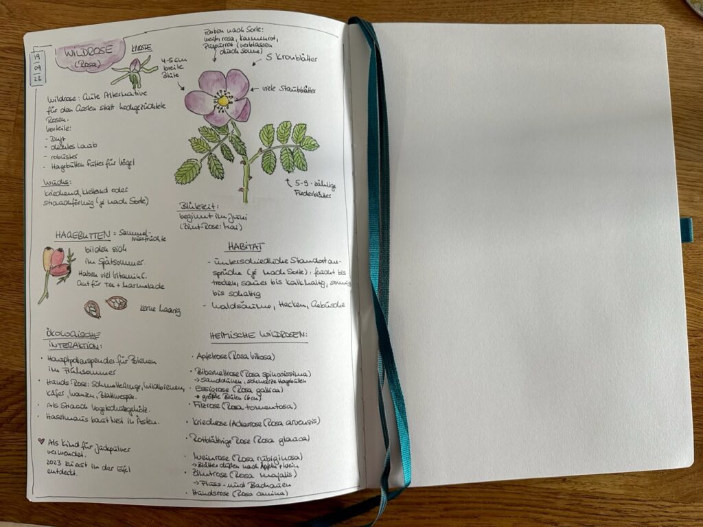 Die Woche habe ich also ein bißchen Zeit damit verbracht, mich für die Ausbildung zu sortieren, die Grundlagen durchzuarbeiten und habe mich meinem ersten „Artenstudium“ gewidmet. Es begann mit der Wildrose, die ich ja total unterschätzt hatte. Ich wußte gar nicht, dass sie so eine tolle Alternative zu den gezüchteten Rosen ist, weil sie so schön duftet, viel robuster ist und vor allem mit ihren Blüten und später den Hagebutten auch eine wunderbare Nahrungsquelle für Tiere ist.