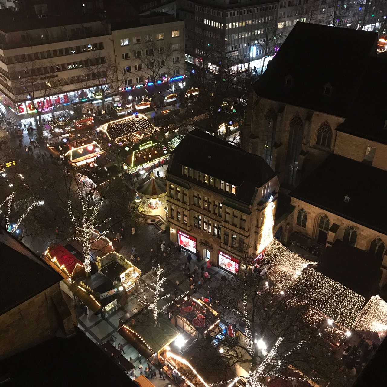 Im Anschluss an die Viertelsternstunde sind wir dann auf den Kirchturm gestiegen. Ein anstrengender Aufstieg, aber es hat sich gelohnt. Trotz Nieselwetter hatten wir eine fantastische Sicht auf die Stadt. Mit den weihnachtlichen Lichtern und dem Ausblick auf den großen Weihnachtsbaum war das wirklich toll!