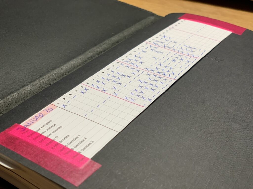 Nach den Rauhnächten hatte ich angefangen, gute Gewohnheiten einzurichten. Und damit ich mich da selber diszipliniere, habe ich entschieden, wieder mit einem Gewohnheiten-Tracker zu arbeiten. Ich habe also am Rechner eine Tabelle gemacht, in die ich alles eingetragen habe, was ich am Tag so Gutes für mich tun will. Die hab ich dann ausgedruckt und in meinen Kalender geklebt. Und hier halte ich jetzt nach, ob ich alles erledigt habe, was ich will.