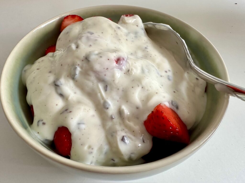 Als Janine letzte Woche Freitag zum Spargelessen da war, hab ich als Nachtisch einfach Erdbeeren mit fertigem Stracciatella-Joghurt aus dem Kühlregal gemacht. Das war mega einfach und mega lecker.