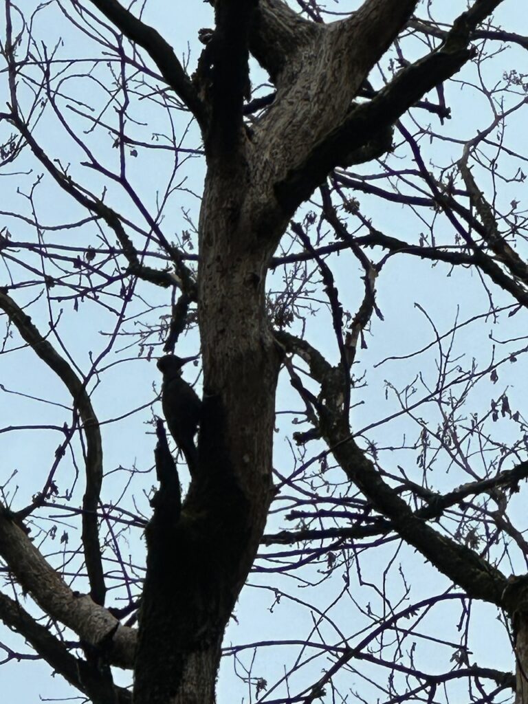 Am Sonntagmorgen konnten wir einen Schwarzspecht beobachten. Wir hörten es oben im Wald hacken und als wir hochsahen, entdeckten wir einen ziemlich großen Specht, der wie wild in das kahle Geäst der Eiche zimmerte und große Platten der alten Rinde zu Boden warf. Ich war mir erst nicht sicher, was das für eine Spechtart war. Wir konnten nur sehen, dass er am Hinterkopf ein Häubchen hatte und dass er ziemlich dunkel war. Meike hat mich später drauf gebracht, dass es ein Schwarzspecht war. Toll! Mein erster Schwarzspecht!
