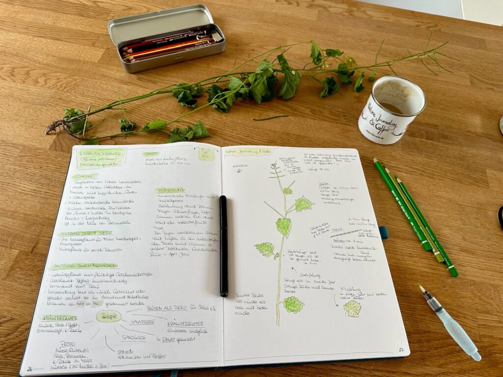 Und so sah mein fertiges Journal dann aus. Der Kaffee war inzwischen leer und die Knoblauchsrauke schon ziemlich verwelkt. Super war das!