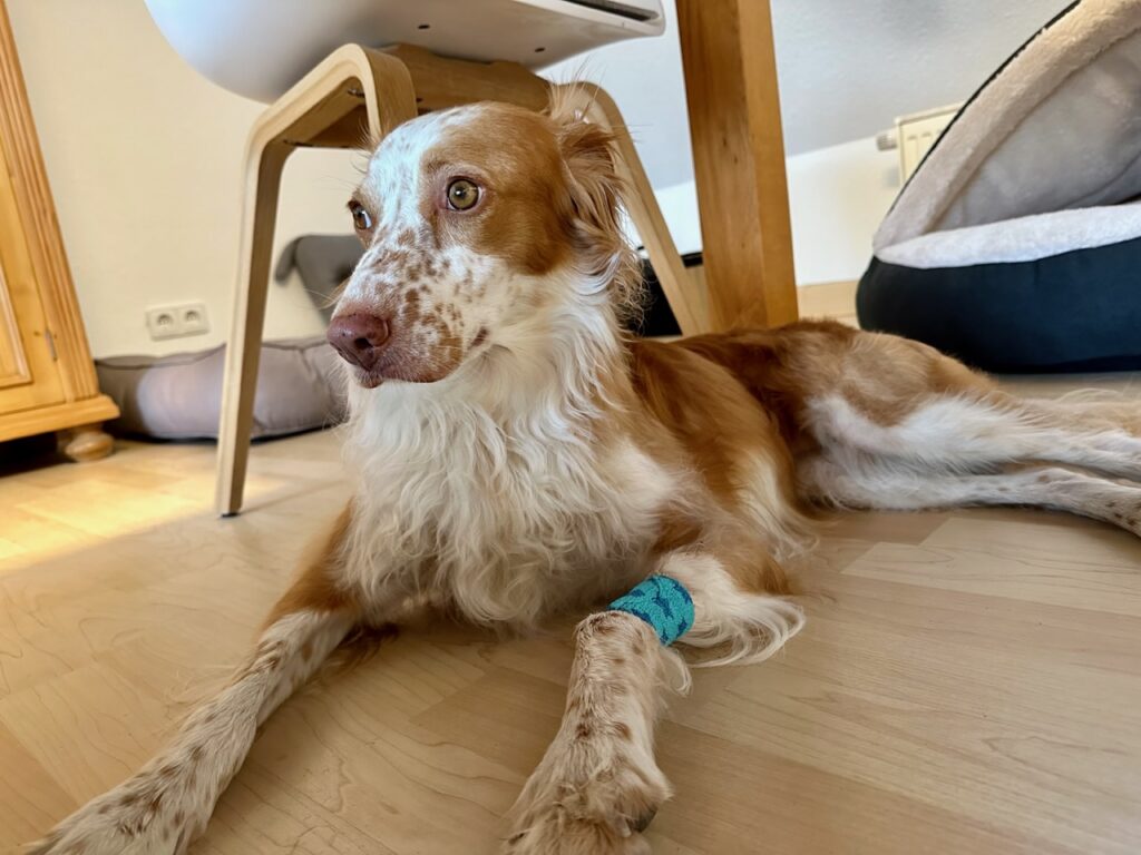 Lise lag dann nach der Blutabnahme mit ihrem schicken Sternen-Verband zuhause und machte sich Sorgen wegen des Gewitters, daher der etwas skeptische Gesichtsausdruck. Aber sie ist wieder fit und ich bin bin wieder happy!