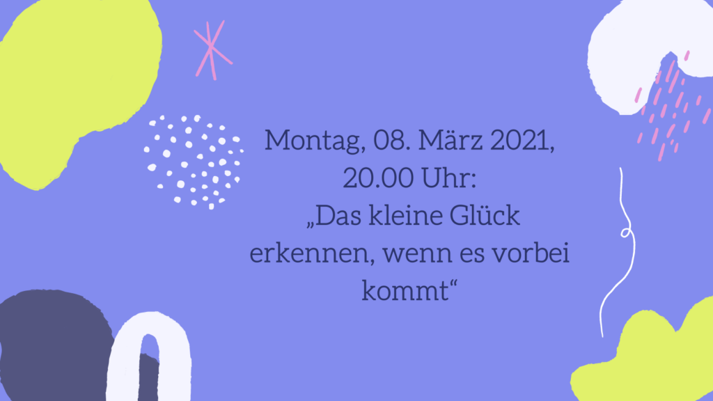 Die nächste und letzte Ausgabe findet am 8. März statt. Diesmal besprechen wir, wie wir das kleine Glück erkennen, wenn es vorbei kommt. Kostenlose Tickets gibt es hier.