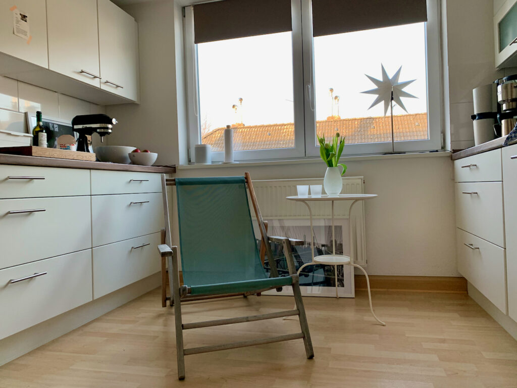 Daher hatte ich letztes Jahr die Idee, meinen Liegestuhl zunächst in der Küche aufzustellen. Der Korbstuhl verschwindet dann so lange im Schafzimmer.