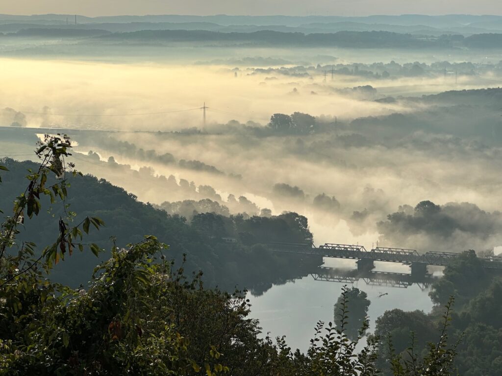 Besonders begeistert mich um diese Jahreszeit immer der Blick ins Ruhrtal. Wenn der Nebel im Tal liegt und die Sonne gerade rauskommt, ist das einfach immer wieder ganz wundervoll!
