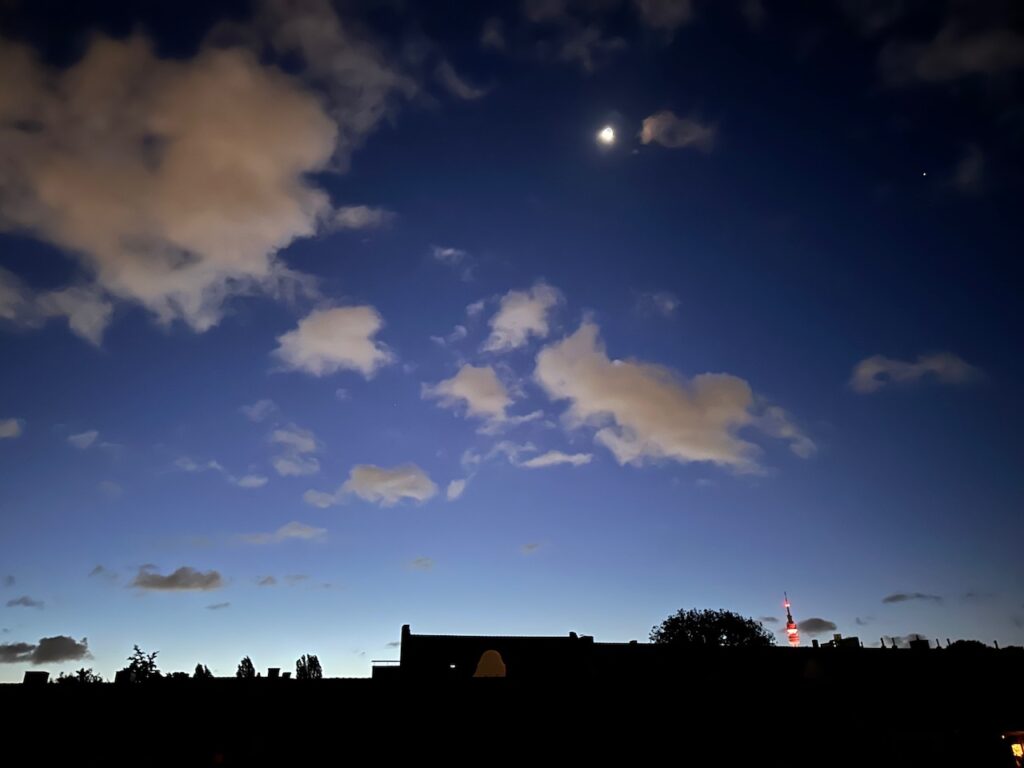 - Am Freitagmorgen beim Blick aus dem Fenster eine schöne Dächersilhouette inkl. abnehmendem Mond zu sehen (der auf den Handy-Fotos irgendwie immer rund aussieht…).