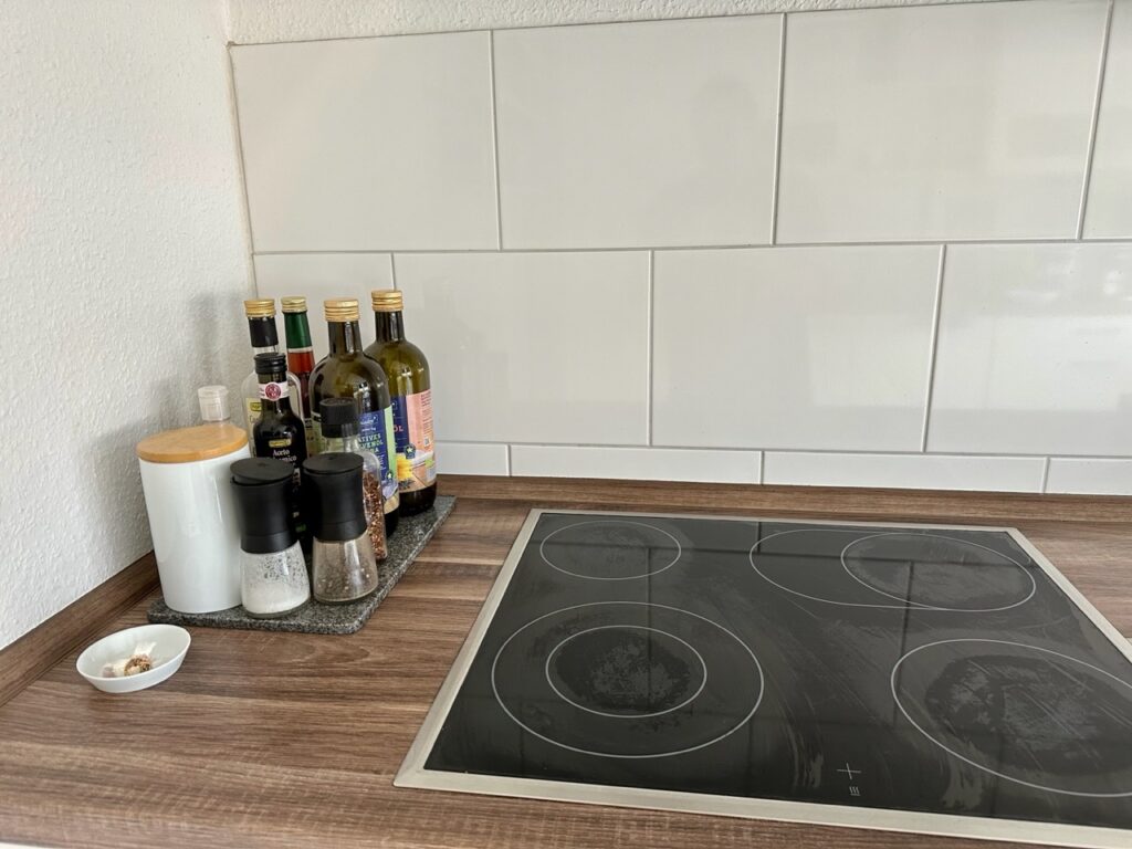 In der Küche habe ich meine Öl- und Gewürze-Ecke neben dem Herd aufgeräumt und verkleinert. Bislang standen da immer eine Holzkiste und davor eine Steinplatte mit Zeugs. Ich hab das jetzt minimiert und jetzt liegt nur noch die Steinplatte da. So sieht es viel aufgeräumter aus und ich bemühe mich, die Auswahl an Öl und Essig entsprechend zu reduzieren. Wie drei geöffnete Flaschen Balsamico in meinen Besitz kamen, entzieht sich allerdings irgendwie grad meiner Erkenntnis… Da muss ich wohl zusehen, dass ich zwei davon bald mal aufbrauche. 😉