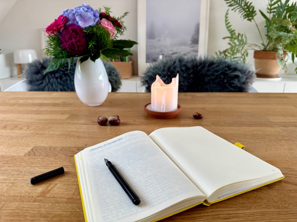 Mir hilft bei all dem Erforschen das Schreiben mit Stift und Papier immer sehr. Das Durcheinander an Gedanken, Emotionen und Körperempfindungen in Worte zu fassen, erleichtert mir den Dialog mit mir selbst enorm. Ich erkenne durch das Schreiben in meinem Journal so vieles, was ich nur durch Denken gar nicht über mich herausgefunden hätte. Während der Stift über das Papier gleitet, denke ich oft „Ah, spannend!“ und „Oh, so ist das also!“. Toll! Und so einfach. 😉
