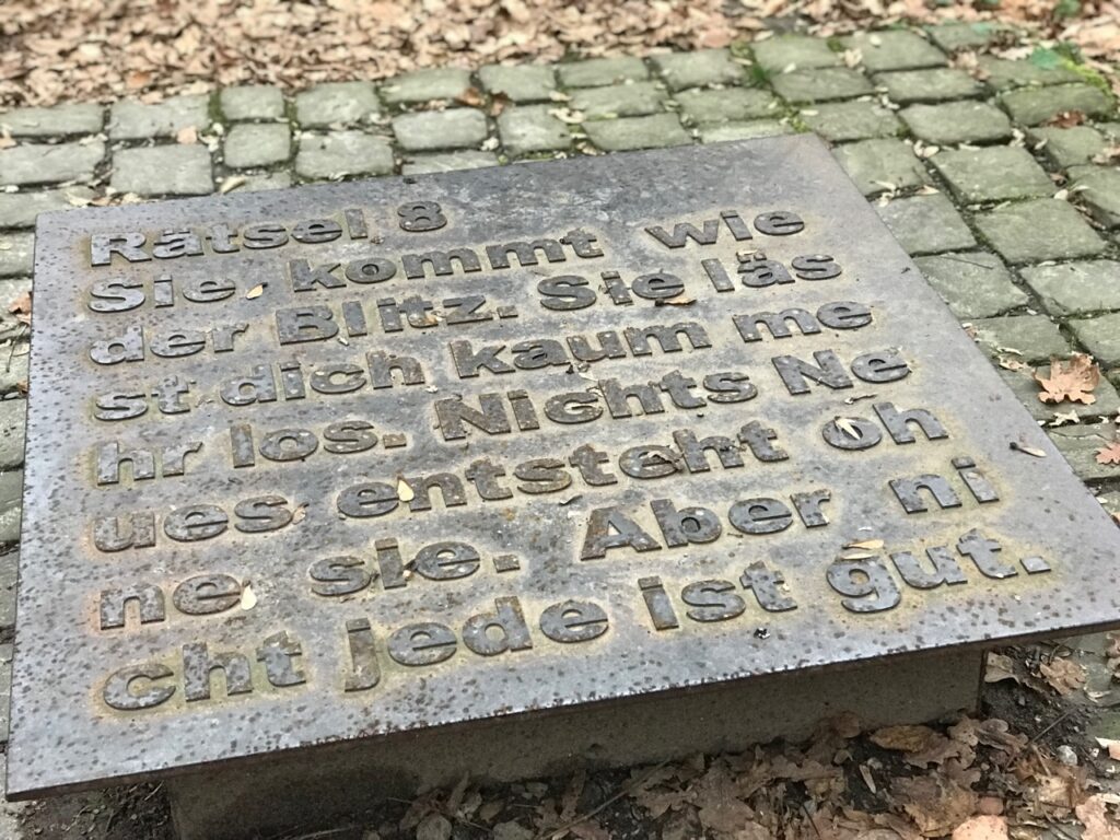 Übrigens haben wir im Brückenpark auch Rätseltafeln entdeckt. Zehn Metallplatten, auf denen verschiedene Rätsel stehen, sind auf den Boden montiert. Die Lösungen findet man – wenn man die Antwort nicht selbst weiß – im Brückenpark verteilt. Dort liegen die gleichen Tafeln, aber diese können „zaubern“. Wenn man sich drauf stellt, erscheint eine Stimme, die Dir des Rätsels Lösung erklärt. Wir hatten viel Spaß damit!